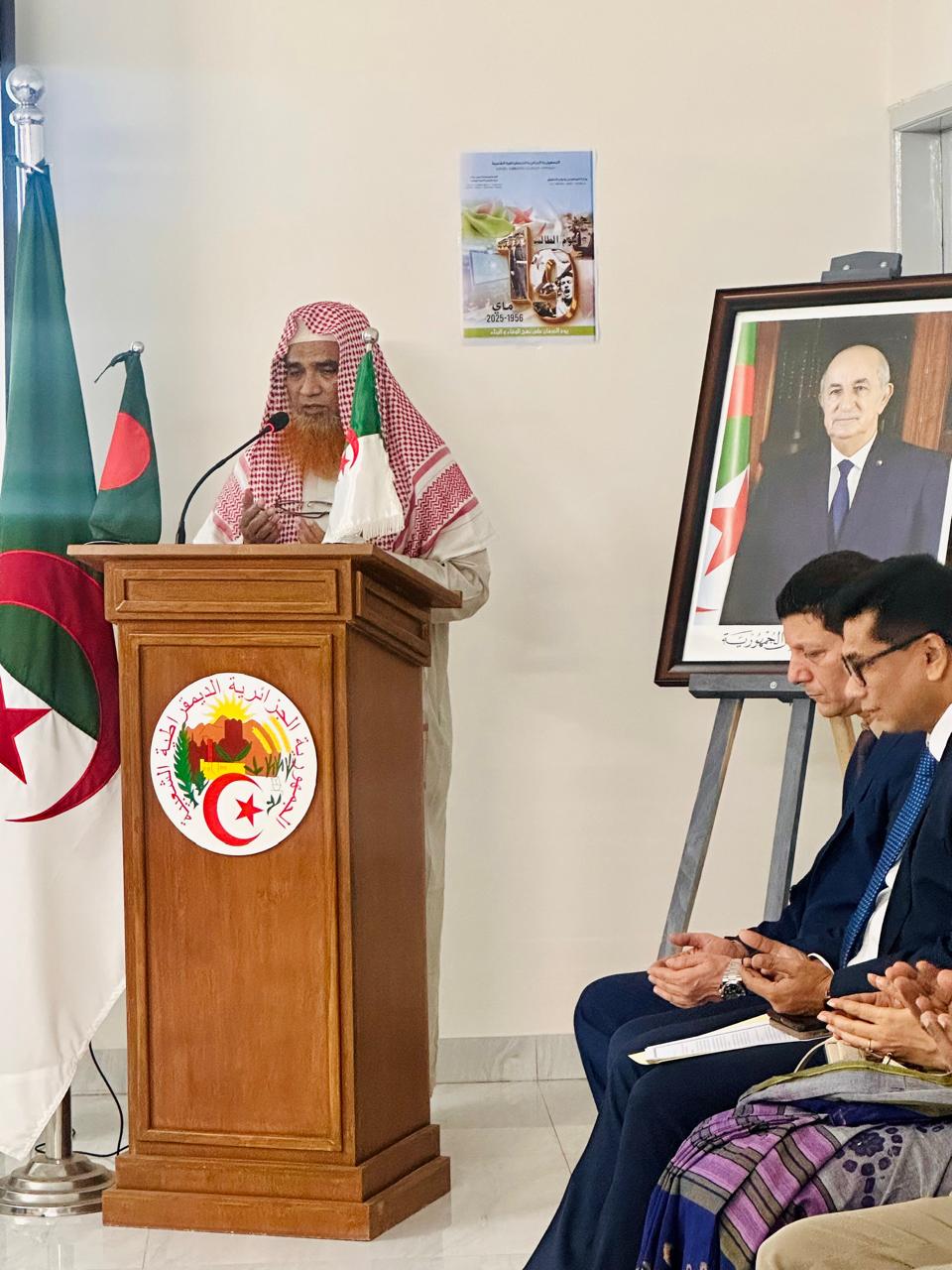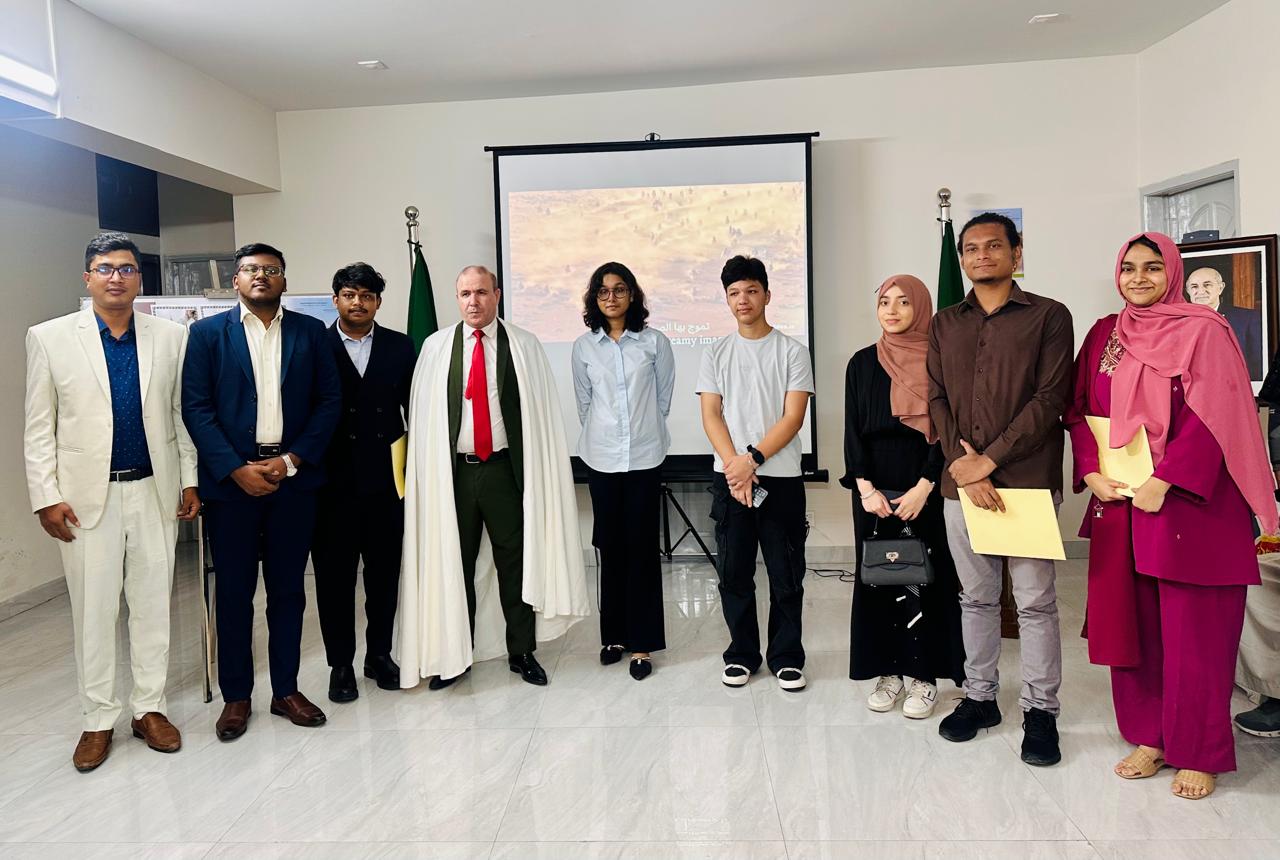The Ambassador of Algeria Abdelouahab Saidani delivered a special speech on the significance of the historic day, where he marked how the students of Algeria and abroad—including those in secondary education adjourned their studies for a greater cause by the historic call of the General Union of Algerian Muslim Students (UGEMA) and participated at the national liberation movement. He remembered with great pride, the committed dedication and patriotism portrayed by all the students during the revolution movement. He reinforced the notable progress of Algeria in education including the great rise in overall literacy rates, and nationwide establishment of universities and institutes. He also urged and encouraged the students of both Algeria and Bangladesh, two friendly and brotherly nations considered as pillars of the Islamic Ummah, to participate in inter-university exchanges, student exchanges, and programs in order to strength the bilateral cooperation.